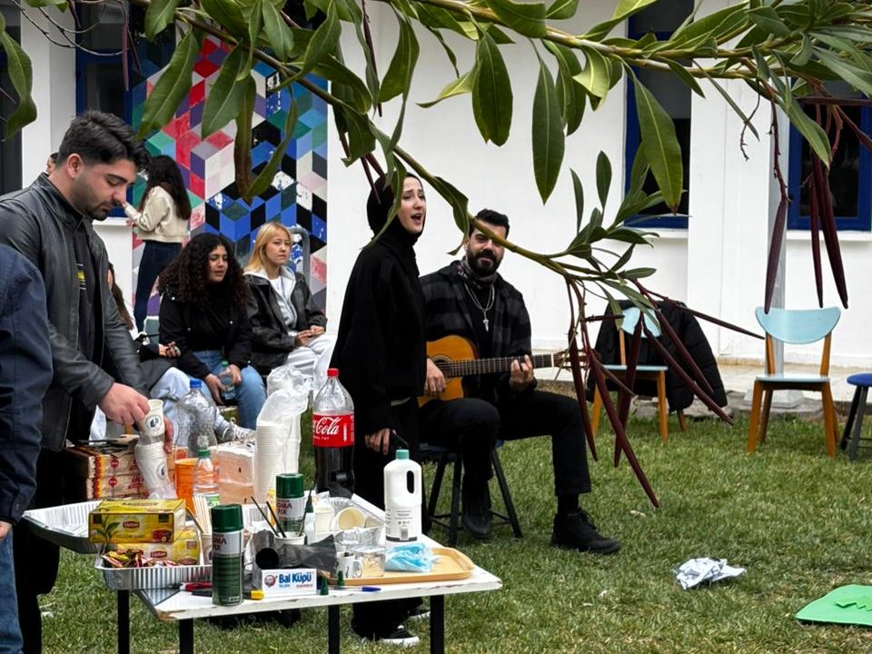 The warm atmosphere was enhanced by soft drinks and a small live music performance, which added a relaxed and cheerful mood to the gathering. Laughter, conversation, and music filled the space as students and faculty mingled among the installations.